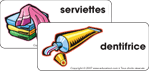 (Ouvrir étiquettes-mots) Baignoire, douche, débarbouillette, serviette, savon, cure-oreille, parfum, bulles, shampoing, microbe, brosse à dents, dentifrice.