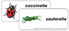 Chaque semaine, nous vous proposons un jeu d’étiquettes-mots que vous pouvez utiliser comme déclencheur pour la causerie ou dans votre coin lecture et écriture, ou même pour identifier vos différents bacs thématiques. (Ouvrir étiquettes-mots) Mouche, fourmi, sauterelle, papillon, coccinelle, abeille, libellule, moustique, chenille, ver de terre, feuille, lucioles.
