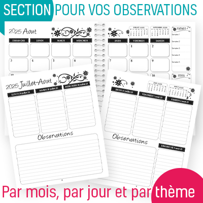• Des divisions simples et bien espacées pour chaque mois, chaque jour, chaque thème et activités.