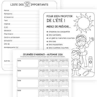 • Pour chaque saison; un calendrier à afficher pour planifier les journées d’absence des enfants et des affiches mémo pour le rappel des vêtements saisonniers.